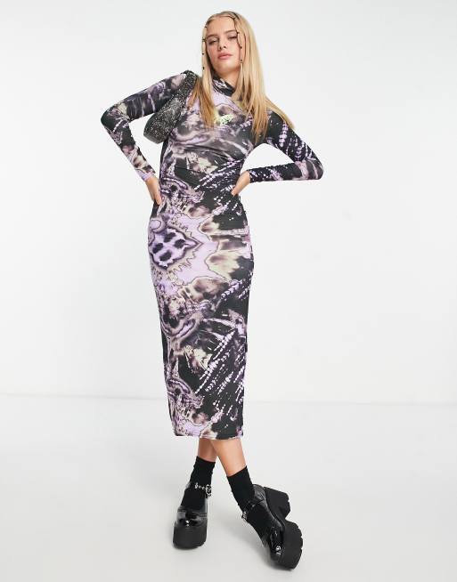 Daisy Street long sleeve grunge midi bodycon dress in tie dye with buttefly graphic Very well made.