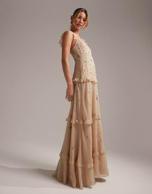 ASOS DESIGN Bridesmaid tulle pinny maxi dress with satin ribbon waist detail and pleated skirt in champagne Very well made.