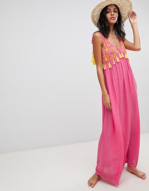 ASOS DESIGN embroidered pom pom trim halter maxi beach dress Very well made.