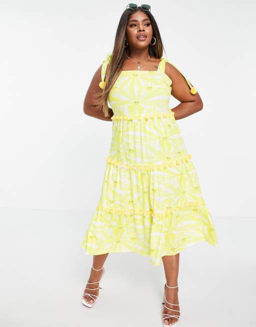 Never Fully Dressed Plus tiered midi sun print dress with pom pom details in yellow Very well made.
