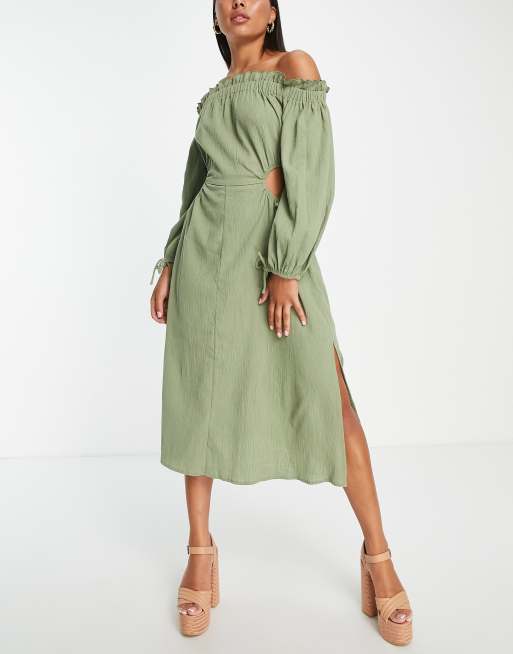 ASOS DESIGN off shoulder cut out waist midaxi beach dress in khaki Very well made.