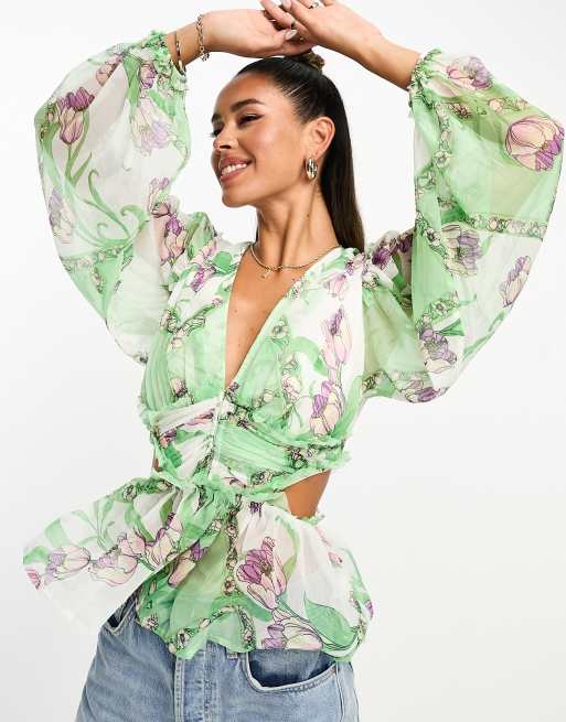 ASOS DESIGN sheer blouse with pleated waist cut out back in ditsy floral Very well made.