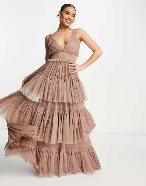 Lace Beads Maxikleid aus T ll in Nerzbraun mit tiefem Ausschnitt und Stufendesign vorne Very well made.