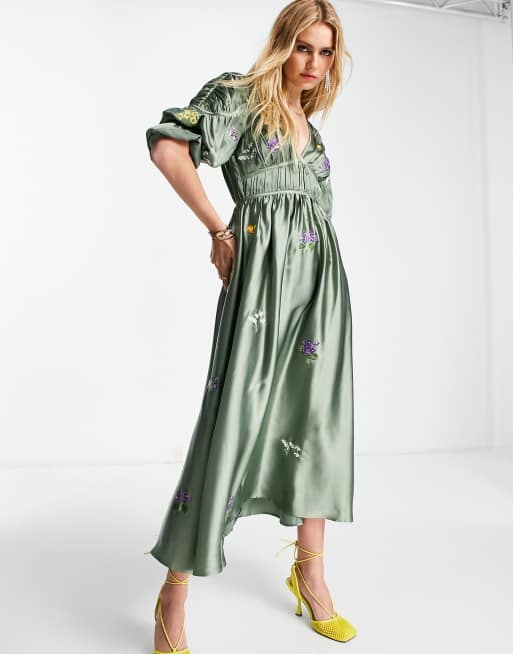 ASOS DESIGN Gr nes Midikleid aus Satin mit gerafftem Detail tiefem Ausschnitt und durchgehender Stickerei Very well made.