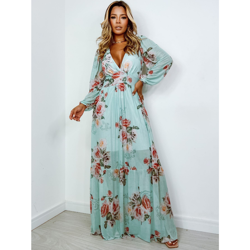 Vestido longo estampado floral manga longa fenda verde menta Very well made.