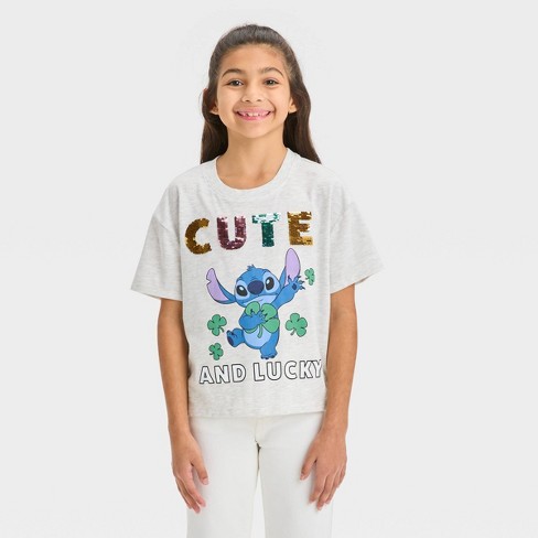 Girls Lilo Stitch Cute and Lucky Flip Sequin Short Sleeve Graphic T Shirt Oatmeal Beige XS Very well made.